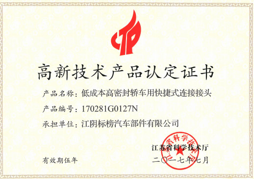 日前,我司低成本高密封轎車用快捷式連接接頭獲江蘇省科學技術廳頒發的高新技術產品認定證書。