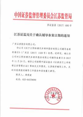 公司已收到江蘇證監局關于確認輔導備案日期的通知,公司將會按照中國證監會《證券發行上市保薦業務管理辦法》等相關文件要求,認真做好輔導工作,及時向江蘇證監局報送輔導工作報告和其他重大事項。