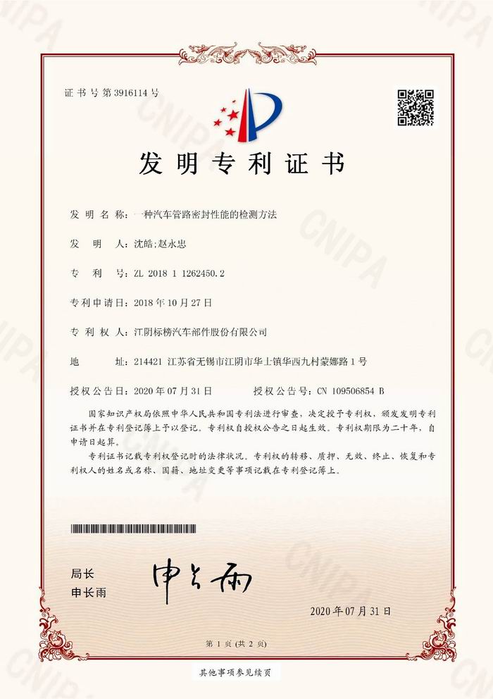 公司研發的“一種汽車管路密封性能的檢測方法”喜獲國家發明專利。